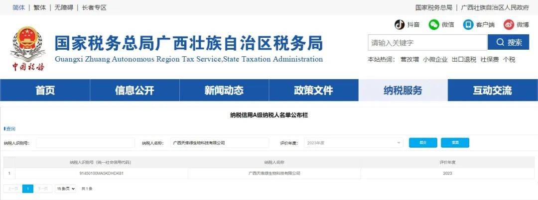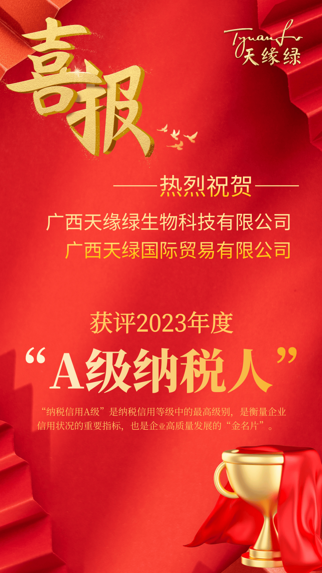 近日,國家稅務(wù)總局公布了2023年度納稅信用評價結(jié)果,天緣綠集團(tuán)母公司——廣西天緣綠生物科技有限公司及子公司——廣西天綠國際貿(mào)易有限公司憑借卓越的納稅信用表現(xiàn),雙雙獲評“2023年度納稅信用A級納稅人”。