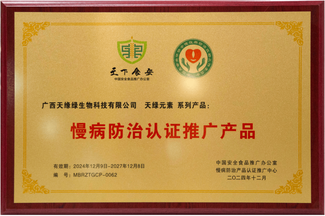 12月12日,天緣綠集團(tuán)傳來振奮人心的消息,集團(tuán)旗下的天綠元素系列產(chǎn)品被中國(guó)安全食品推廣辦公室慢病防治產(chǎn)品認(rèn)證推廣中心正式納入“慢病防治認(rèn)證推廣產(chǎn)品”名錄之中。這一殊榮,不僅是對(duì)天綠元素系列產(chǎn)品在慢病防治領(lǐng)域內(nèi)卓越成效的官方肯定,更是對(duì)天緣綠集團(tuán)長(zhǎng)期致力于人類健康事業(yè)的最大肯定和有力證明。