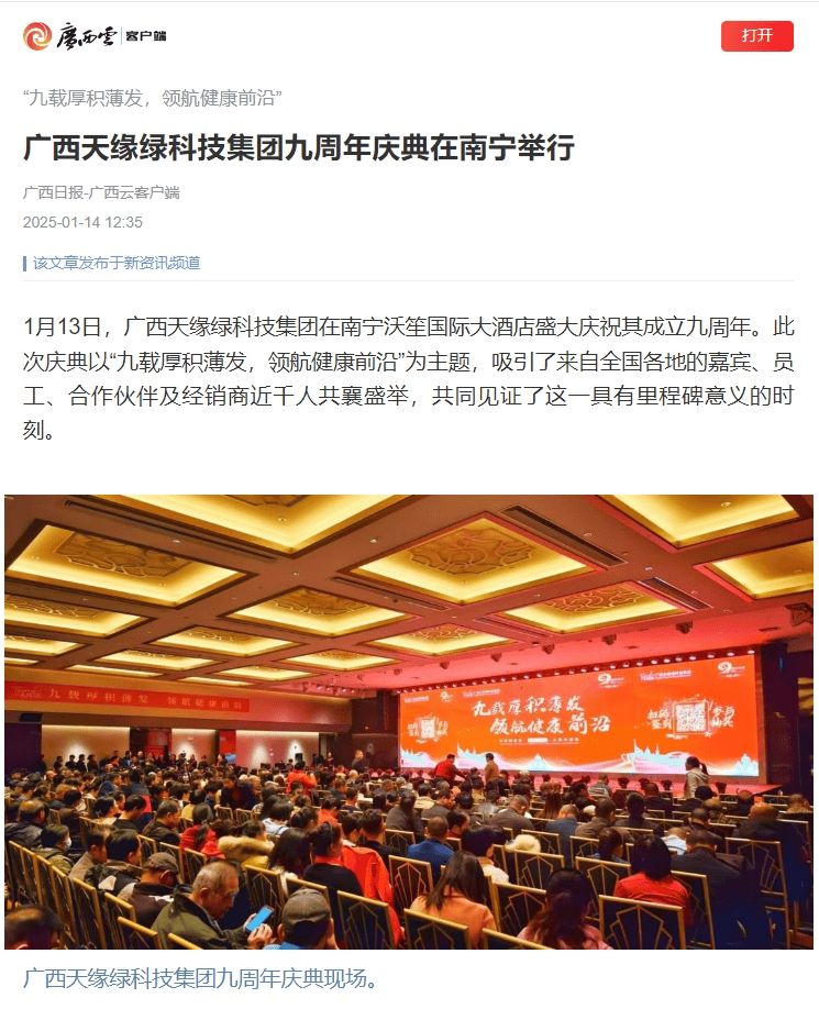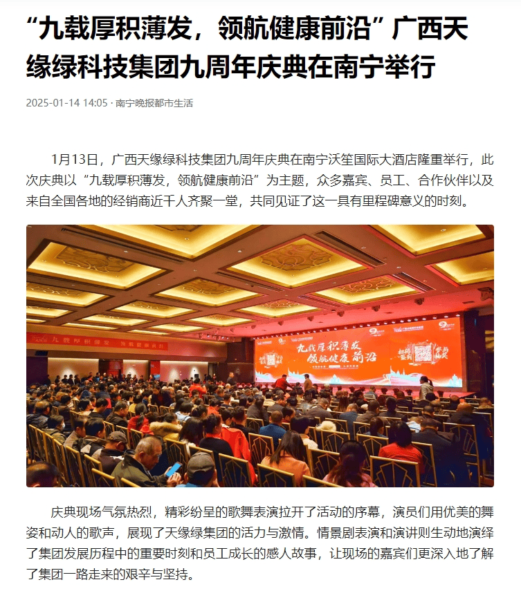 媒體爭相報(bào)道,不僅是對天緣綠集團(tuán)九周年慶典的關(guān)注,更是對集團(tuán)未來發(fā)展的期待與鼓舞。站在新的起點(diǎn)上,天緣綠集團(tuán)將不忘初心,砥礪前行,以更加飽滿的熱情和更加堅(jiān)定的步伐,領(lǐng)航健康前沿,續(xù)寫新的輝煌篇章。
