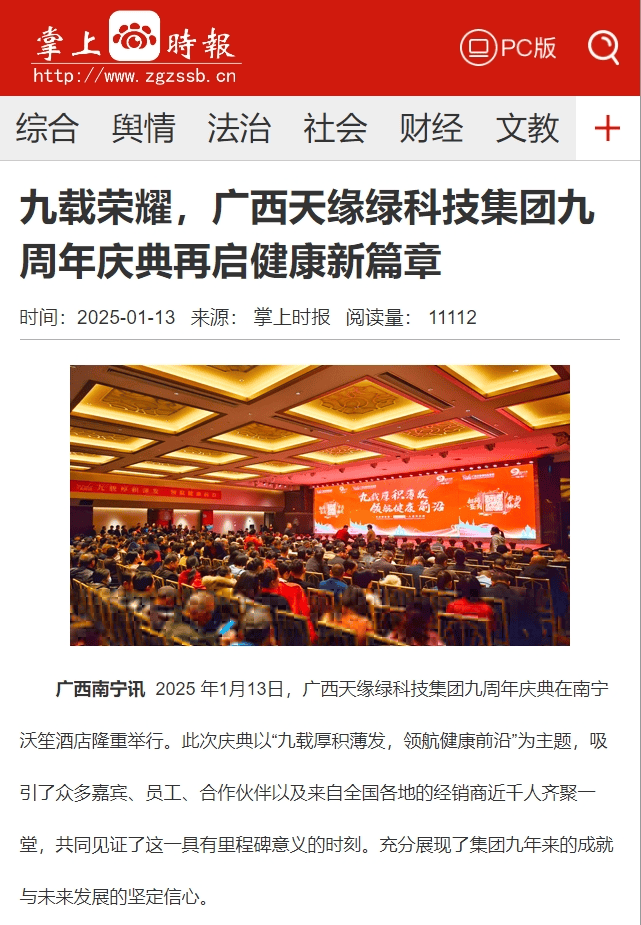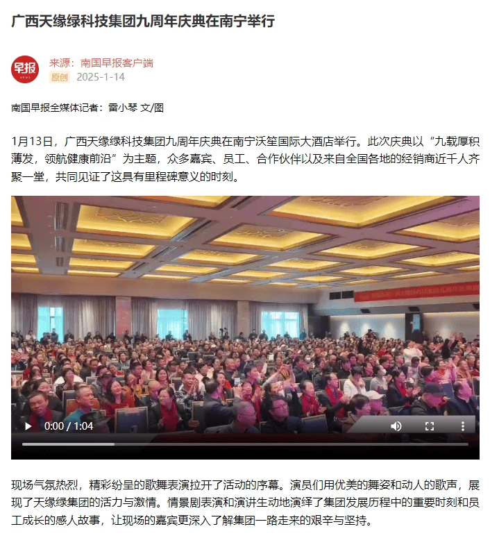 慶典盛況空前,南國早報(bào)、聽聞廣西、東盟新聞周刊、中國報(bào)道、東盟頭條、掌上時(shí)報(bào)、廣西縣域經(jīng)濟(jì)網(wǎng)等三十多家新聞媒體紛紛聚焦此次慶典,競相報(bào)道這一健康產(chǎn)業(yè)的盛事。媒體記者們用鏡頭捕捉每一個(gè)精彩瞬間,用筆觸記錄每一份感動(dòng)與榮耀,將天緣綠集團(tuán)九周年的輝煌與夢想傳遞給千家萬戶。