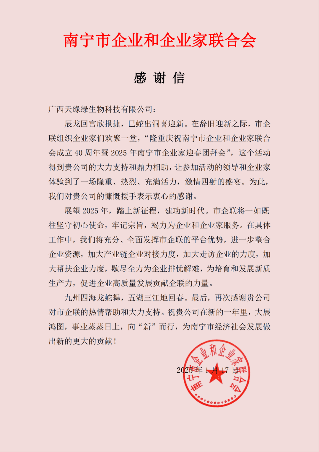 近日,廣西天緣綠科技集團(tuán)收到了南寧市企業(yè)和企業(yè)家聯(lián)合會(huì)(簡(jiǎn)稱“南寧市企聯(lián)”)的深情感謝信,信中對(duì)天緣綠集團(tuán)在“南寧市企聯(lián)成立40周年暨2025年南寧市企業(yè)家迎春團(tuán)拜會(huì)”中的慷慨支持與鼎力相助表達(dá)了由衷的感激。此次活動(dòng)在天緣綠集團(tuán)的助力下,不僅取得了圓滿成功,更讓每一位參與其中的領(lǐng)導(dǎo)和企業(yè)家深切感受到了市企聯(lián)的熱情與蓬勃活力。