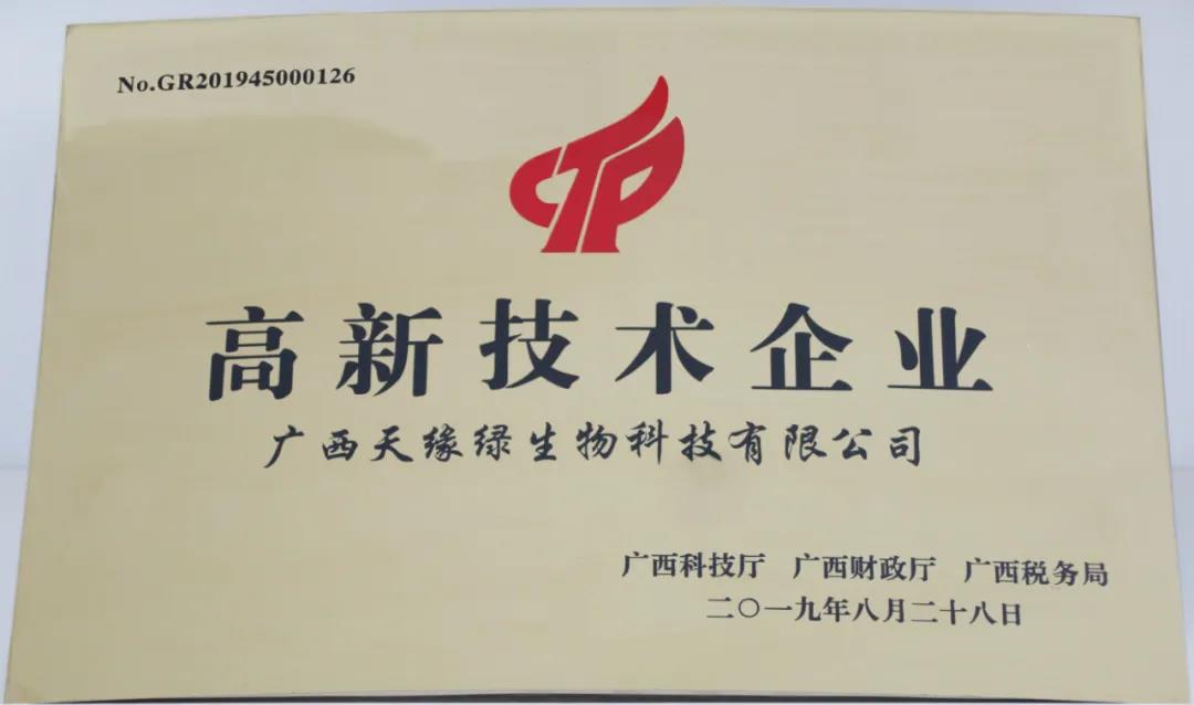 2022年10月,廣西天緣綠生物科技有限公司再次通過“國(guó)家高新技術(shù)企業(yè)”認(rèn)定